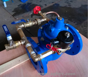 當(dāng)閥門(mén)從進(jìn)口端給水時(shí),水流過(guò)針閥進(jìn)入主閥控制室,出口壓力通過(guò)導(dǎo)管作用到導(dǎo)閥上。當(dāng)出口壓力高于導(dǎo)閥彈簧設(shè)定值時(shí),導(dǎo)閥關(guān)閉。控制室停止排水,此時(shí)主閥控制室內(nèi)壓力高升關(guān)閉主閥,出口壓力不再升高。當(dāng)閥門(mén)出口壓力下降到導(dǎo)閥彈簧設(shè)定壓力時(shí),導(dǎo)閥開(kāi)啟,控制室向下游排水。由于導(dǎo)閥系統(tǒng)排水量大于針閥的進(jìn)水量,主閥控制室壓力下降,進(jìn)口壓力使主閥開(kāi)啟。在穩(wěn)定狀態(tài)下,控制室進(jìn)水、排水相同,主閥開(kāi)度不變,減壓效果明顯。